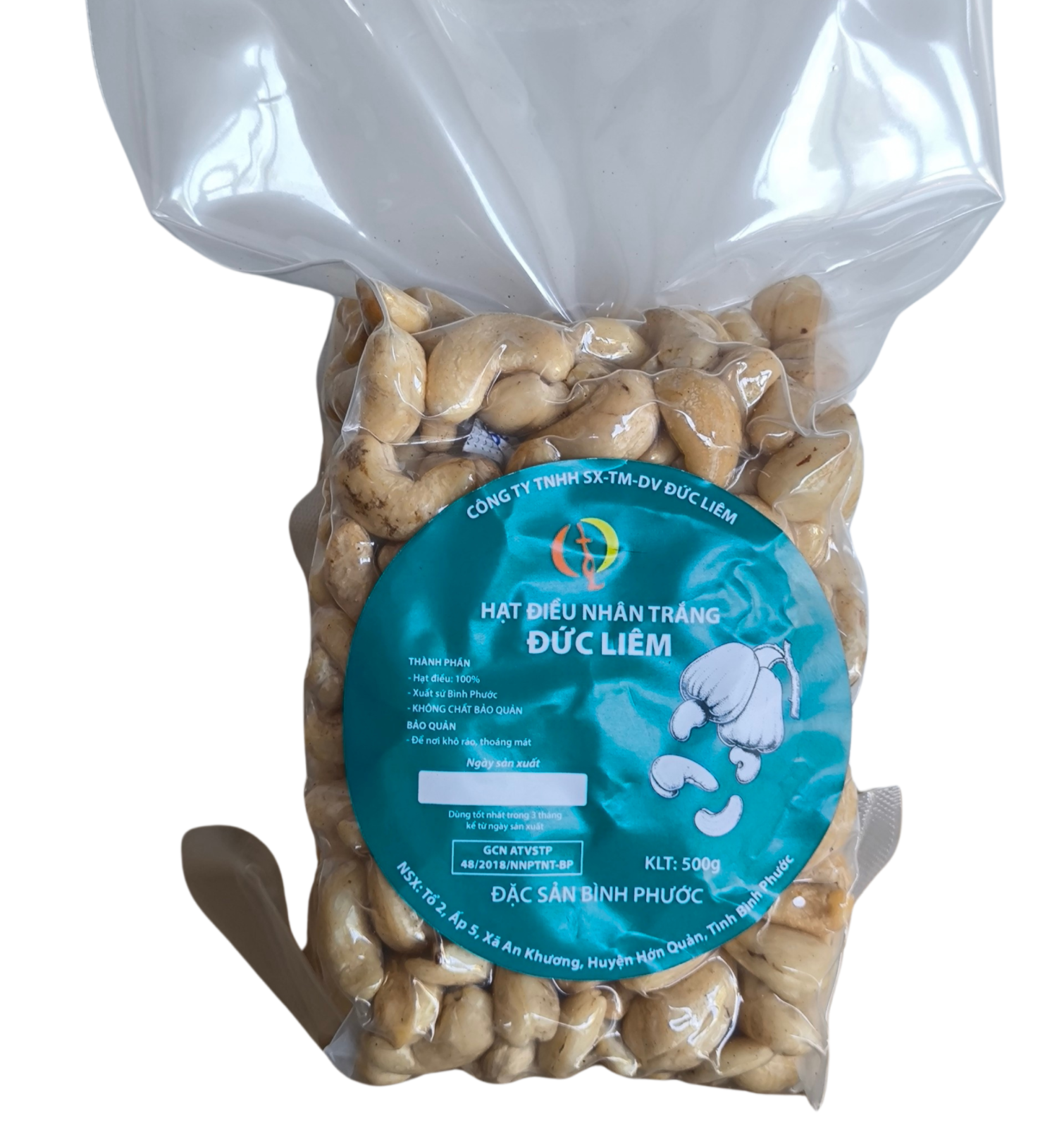 - Tên sản phẩm: Điều nhân trắng nguyên hạt sấy sạch lụa đựng trong túi hút chân không loại 500g