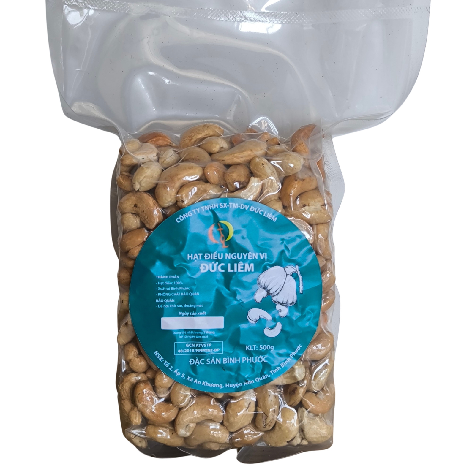 Sản phẩm được làm từ điều Bình Phước nguyên hạt đã bóc sạch vỏ lụa, rang không muối, giữ được vị thơm béo ngọt của hạt điều. Đây là sản phẩm của Công ty TNHH Sản xuất Thương mại Dịch vụ Đức Liêm.