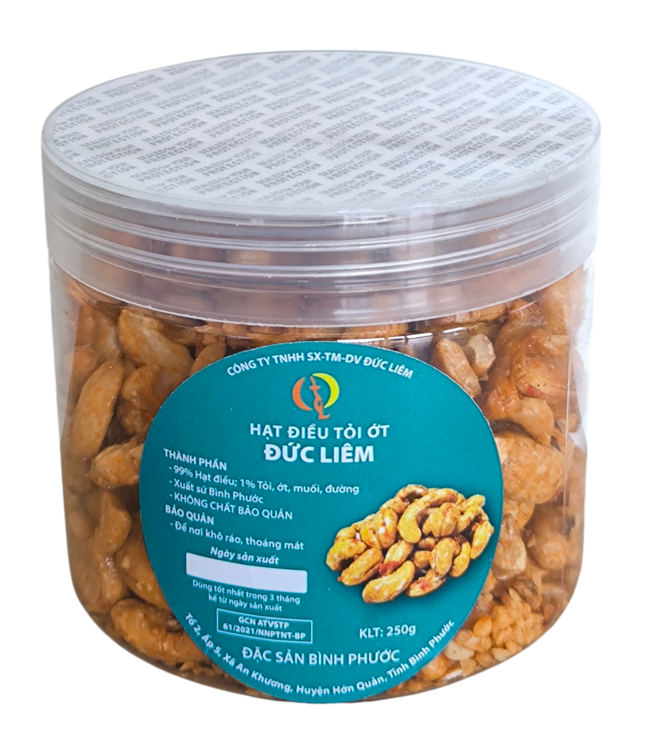 Sản phẩm được chế biến từ điều bình Phước nhân trắng hạt bể, sạch vỏ lụa kết hợp với gia vị, ớt, tỏi tươi, cay nhẹ, béo, giòn kích thích vị giác càng ăn càng cuốn. Thành phần: 99% hạt điều, 1% tỏi, ớt, muối, đường.