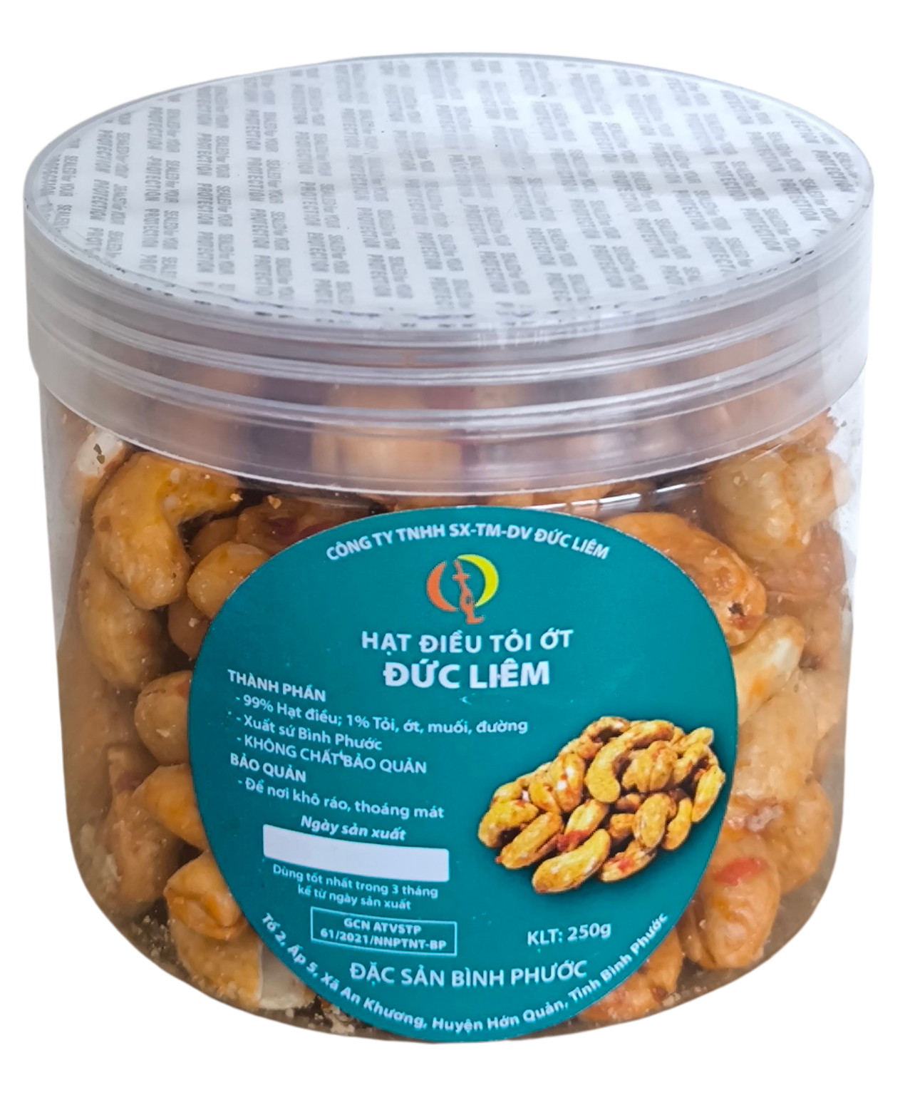Sản phẩm được chế biến từ điều bình Phước nhân trắng nguyên hạt, sạch vỏ lụa kết hợp với gia vị, ớt, tỏi tươi, cay nhẹ, béo, giòn kích thích vị giác càng ăn càng cuốn. Thành phần: 99% hạt điều, 1% tỏi, ớt, muối, đường.