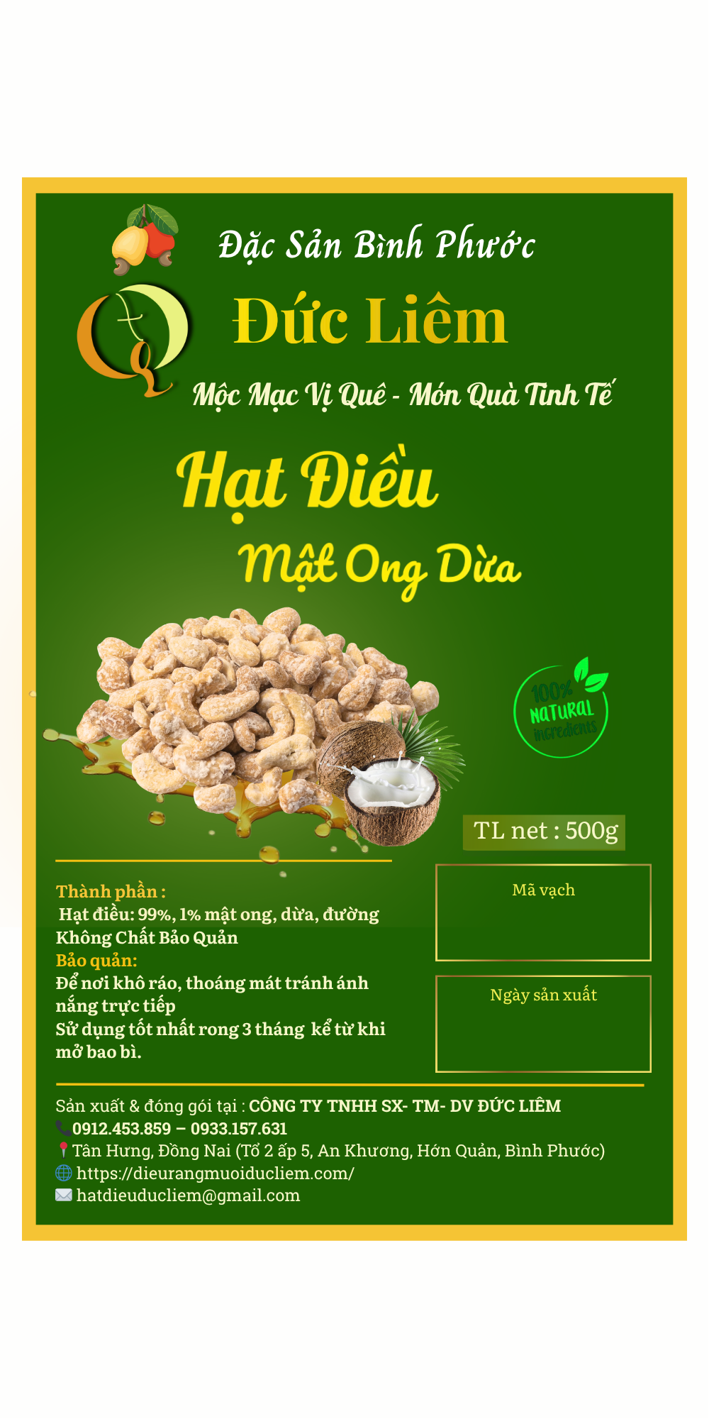 - Tên sản phẩm: Hạt điều mật ong dừa Đức Liêm, hộp pet 500gr (nhãn xanh Đặc sản Bình Phước)