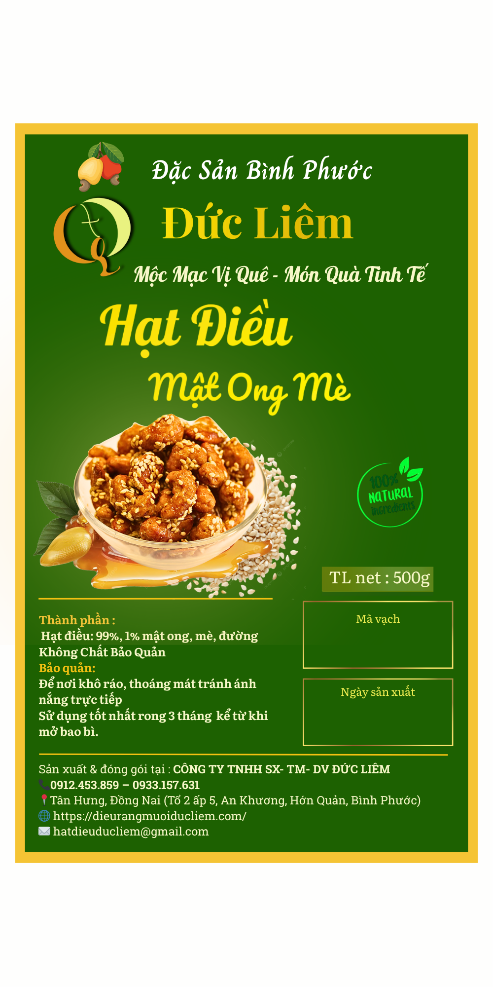 - Tên sản phẩm: Hạt điều mật ong mè Đức Liêm, hộp pet 500gr (nhãn xanh Đặc sản Bình Phước)
