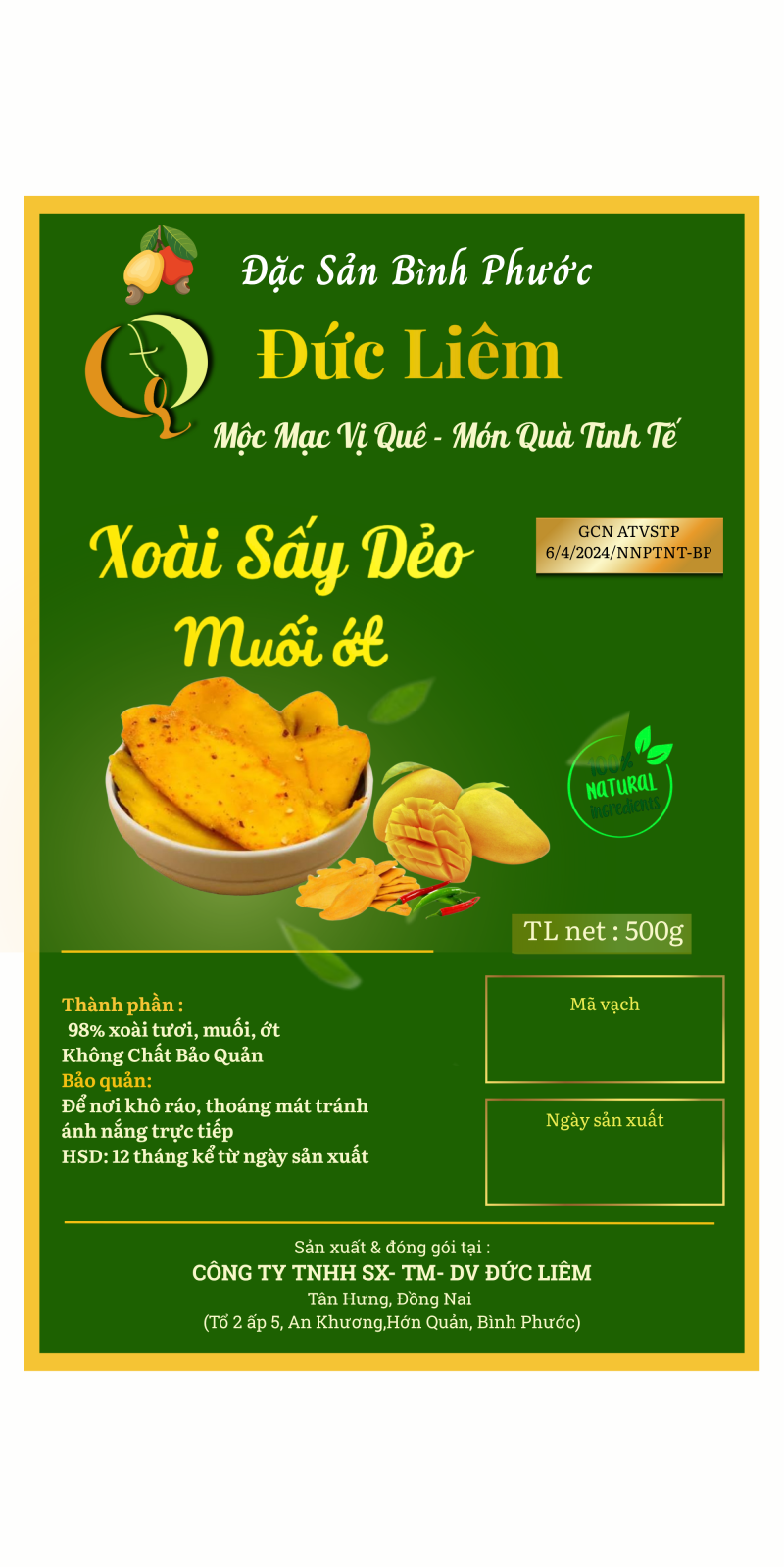 - Tên sản phẩm: Xoài sấy dẻo muối ớt Đức Liêm, hộp pet 500gr (nhãn xanh Đặc sản Bình Phước)