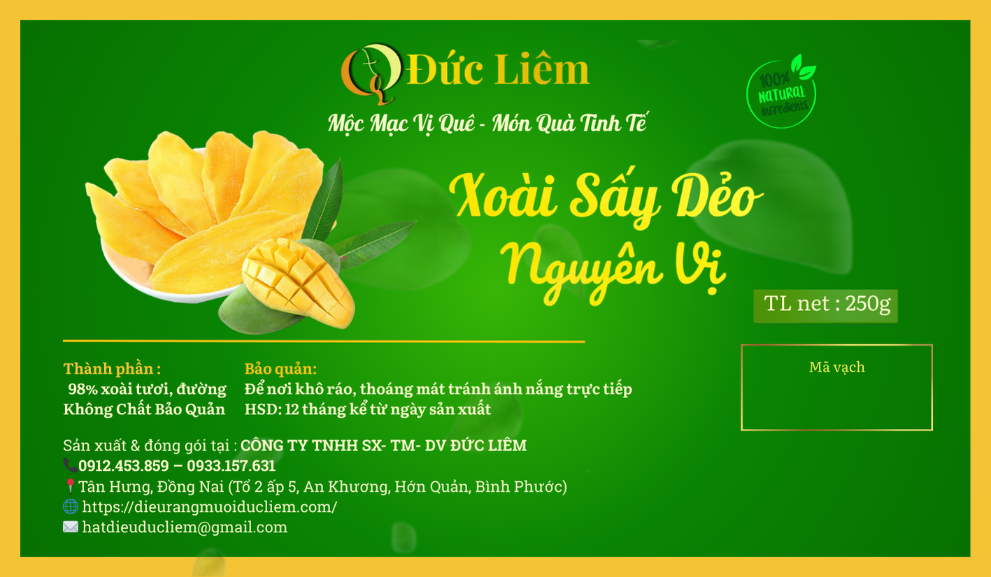 - Tên sản phẩm: Xoài sấy dẻo nguyên vị Đức Liêm, hộp pet 250gr (nhãn xanh Đặc sản Bình Phước)